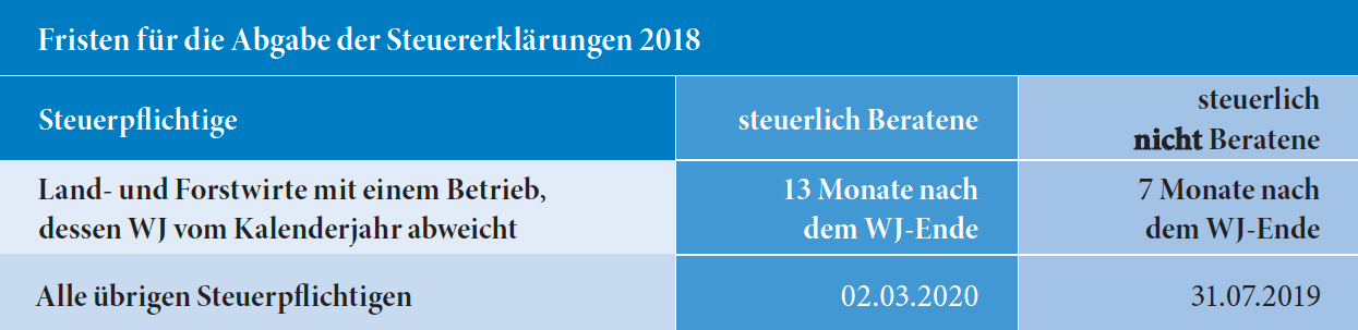 Für steuerlich beratene Steuerpflichtige verlängert sich die Abgabefrist auf Ende Februar des Zweitfolgejahres. Die Einkommensteuererklärung 2018 ist beispielsweise spätestens bis zum 2. März 2020 einzureichen – da der letzte Tag im Februar 2020 auf einen Samstag fällt und sich die Frist dadurch auf den nächsten Werktag verlängert.